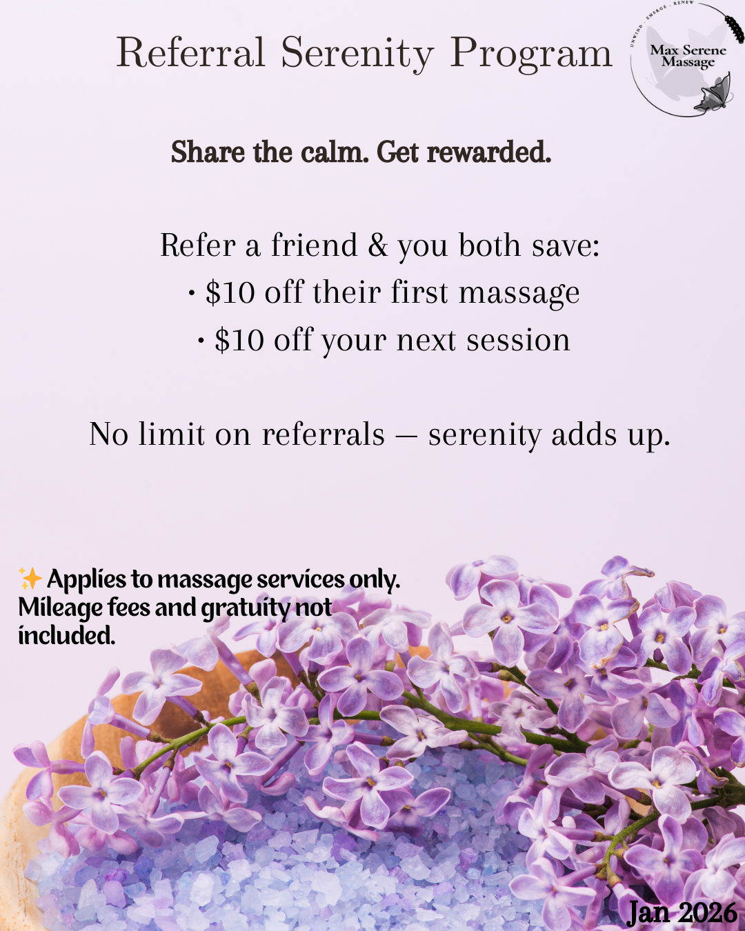 Share the wellness! Refer a friend and receive $10 off your next Max Serenity session.